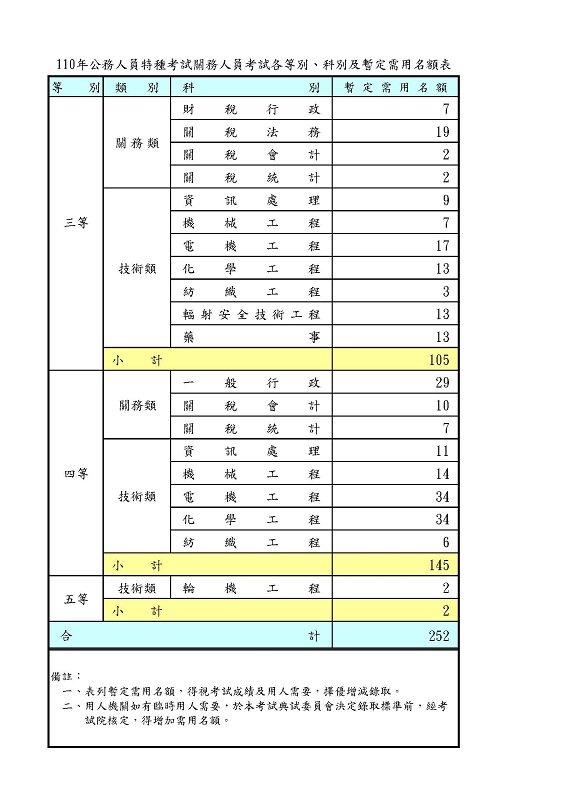 109年關務各科名額 2020 年 11 月 20 日 號外 關務特考名額化工三等13化工四等34名額很多 去年的新聞稿名額三等3名 四等10名 今年成長三倍起跳阿我去年一直很同情關務考生 能幫我就幫快衝阿