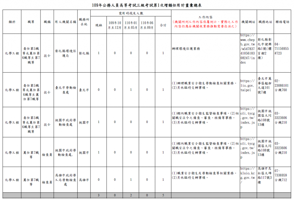 桃園勞檢2(技士1 檢查員1) 高雄勞檢1 (預估缺)