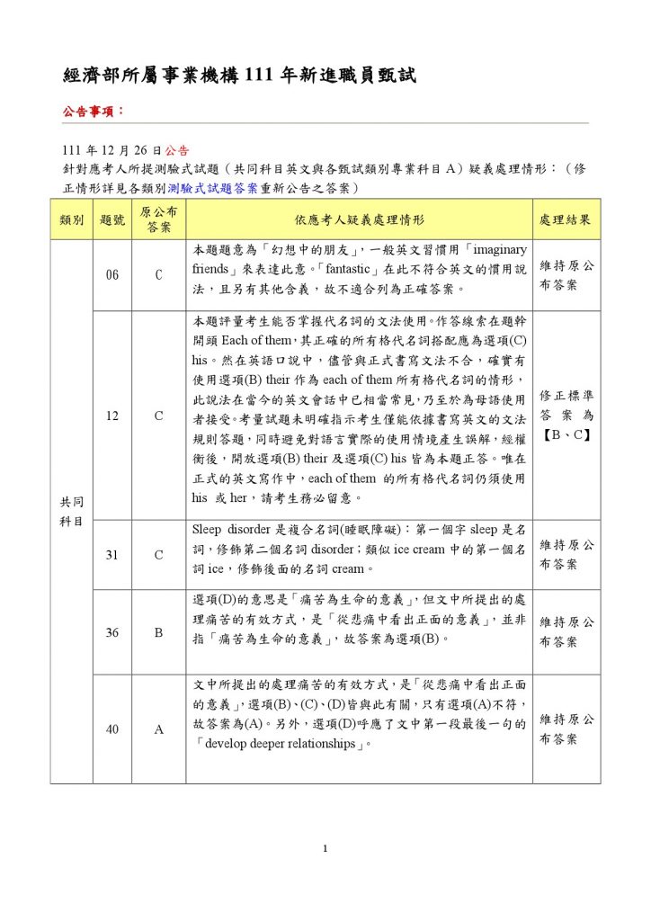 今天國營官方公布試題疑義結果