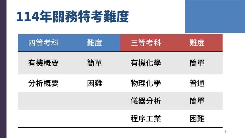 114年關務特考難度 四等最簡單是有機 三等最簡單是有機跟儀分 最簡單的科目最好拿分 強弱最容易拉出差距 是上榜的決勝關鍵