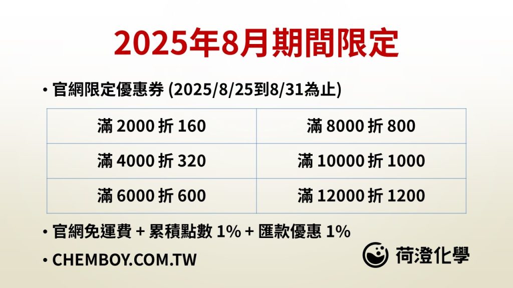 2025年8月限定優惠 2025 年 8 月 25 日 2025年8月限定優惠兩倍折價券8/25 – 8/31期間限定官網免運費 + 累積點數1% + 匯款優惠1% + 兩倍優惠券https://www.chemboy.com.tw/