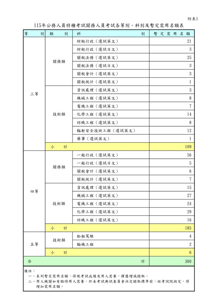 115 年關務特考名額出爐