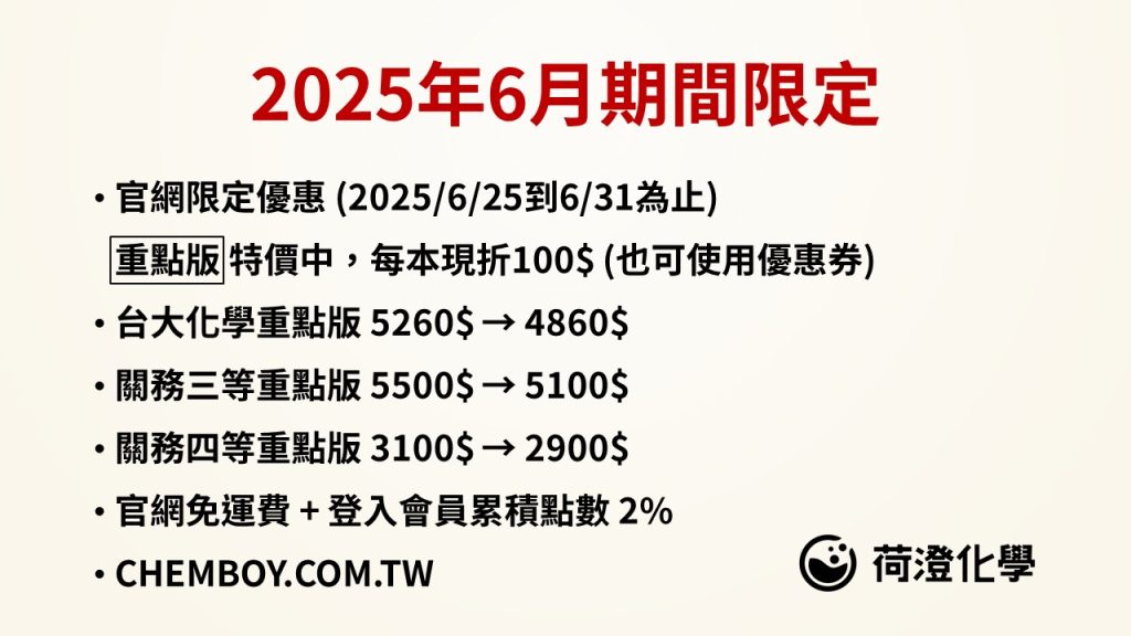新推出 114年關務化工詳解(三等+四等) https://www.chemboy.com.tw/product/114g/ https://shopee 新推出 114年關務化工詳解(三等+四等) 閱讀全文 »
